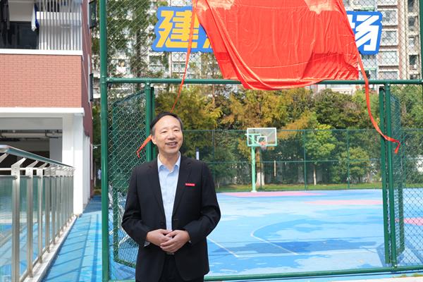 隨后,夏開堂與陶建新共同為“陶建新籃球場(chǎng)”揭牌。紅綢緩緩滑落,嶄新的球場(chǎng)設(shè)施、規(guī)范清晰的劃線與完善的配套設(shè)備全景呈現(xiàn),現(xiàn)場(chǎng)響起持久而熱烈的掌聲,充分表達(dá)了對(duì)校友反哺善舉的由衷敬意。揭牌儀式后,兩人攜手投出球場(chǎng)啟用的“第一球”,標(biāo)志著“陶建新籃球場(chǎng)”正式投入使用,成為校園體育文化建設(shè)的嶄新亮點(diǎn)。