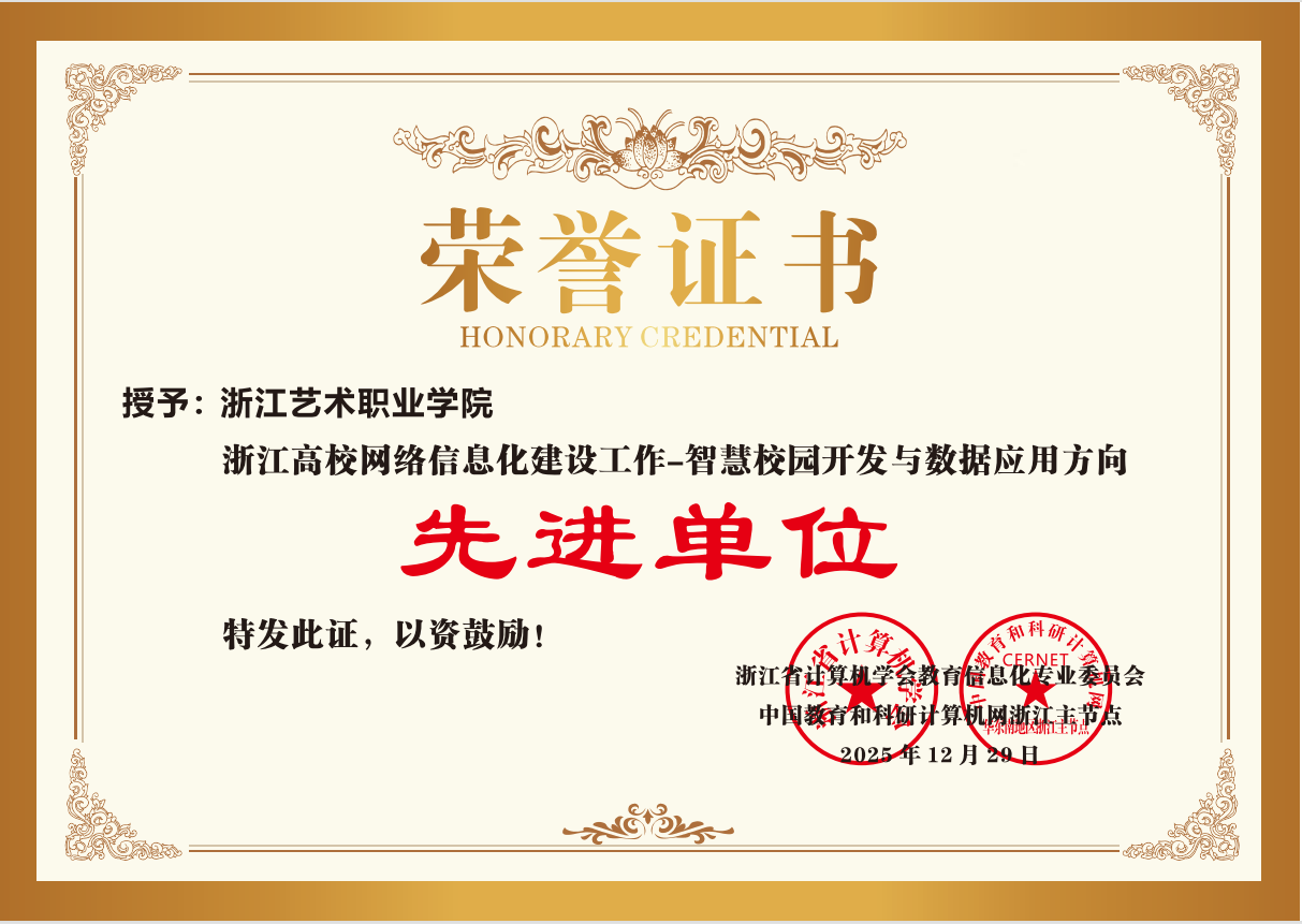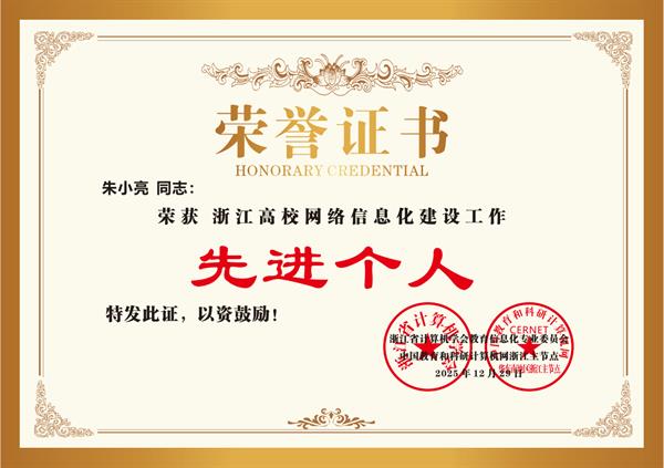 近日,從浙江省計算機學(xué)會教育信息化專業(yè)委員會、中國教育和科研計算機網(wǎng)浙江主節(jié)點傳來喜訊——我校成功獲評2025年度“浙江高校網(wǎng)絡(luò)信息化建設(shè)工作——智慧校園開發(fā)與數(shù)據(jù)應(yīng)用方向先進單位”。這是我校繼2023年度、2024年度之后,連續(xù)第三次獲得“浙江高校網(wǎng)絡(luò)信息化建設(shè)工作先進單位”榮譽。同時,圖書信息中心朱小亮同志榮獲“浙江高校網(wǎng)絡(luò)信息化建設(shè)工作先進個人”稱號。