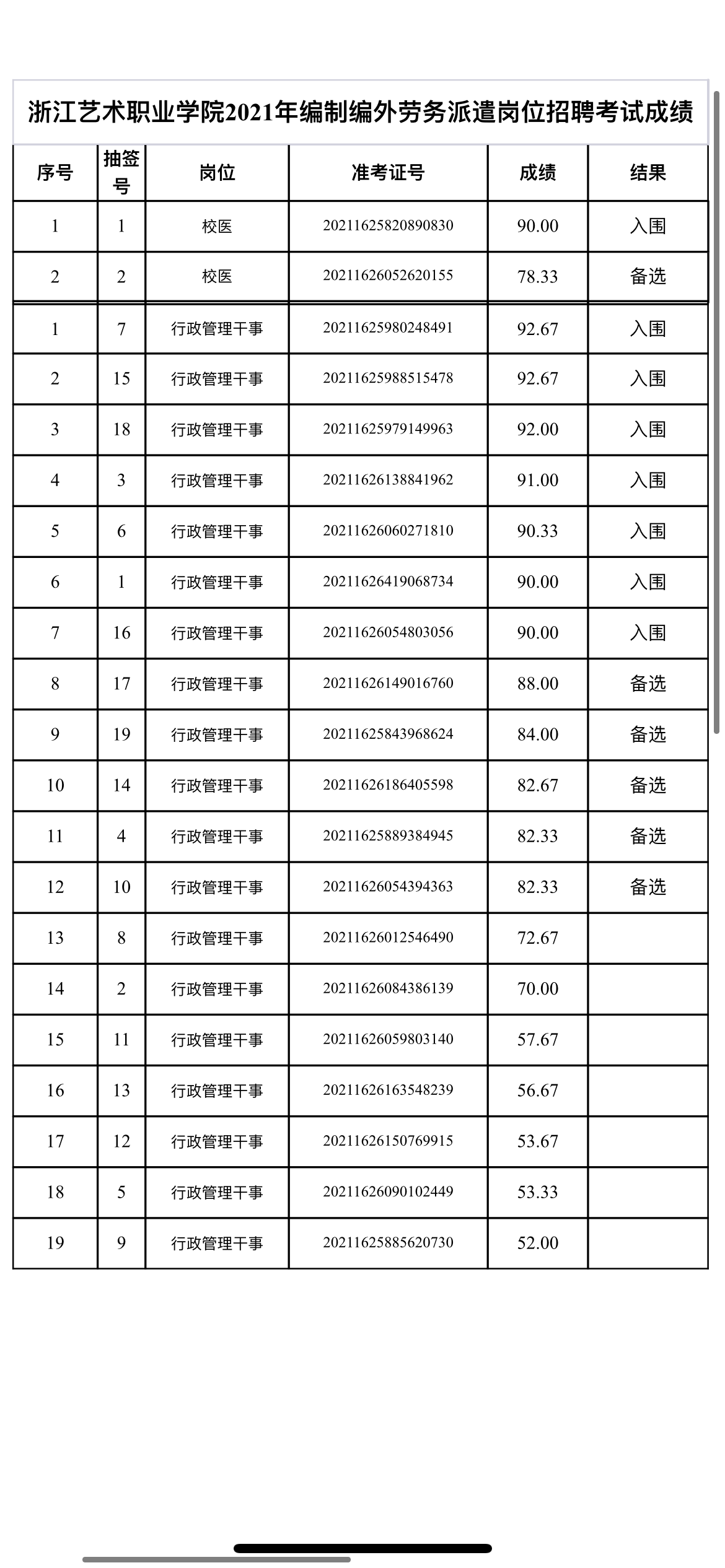 浙江藝術(shù)職業(yè)學院2021年編制編外勞務(wù)派遣崗位招聘考試成績