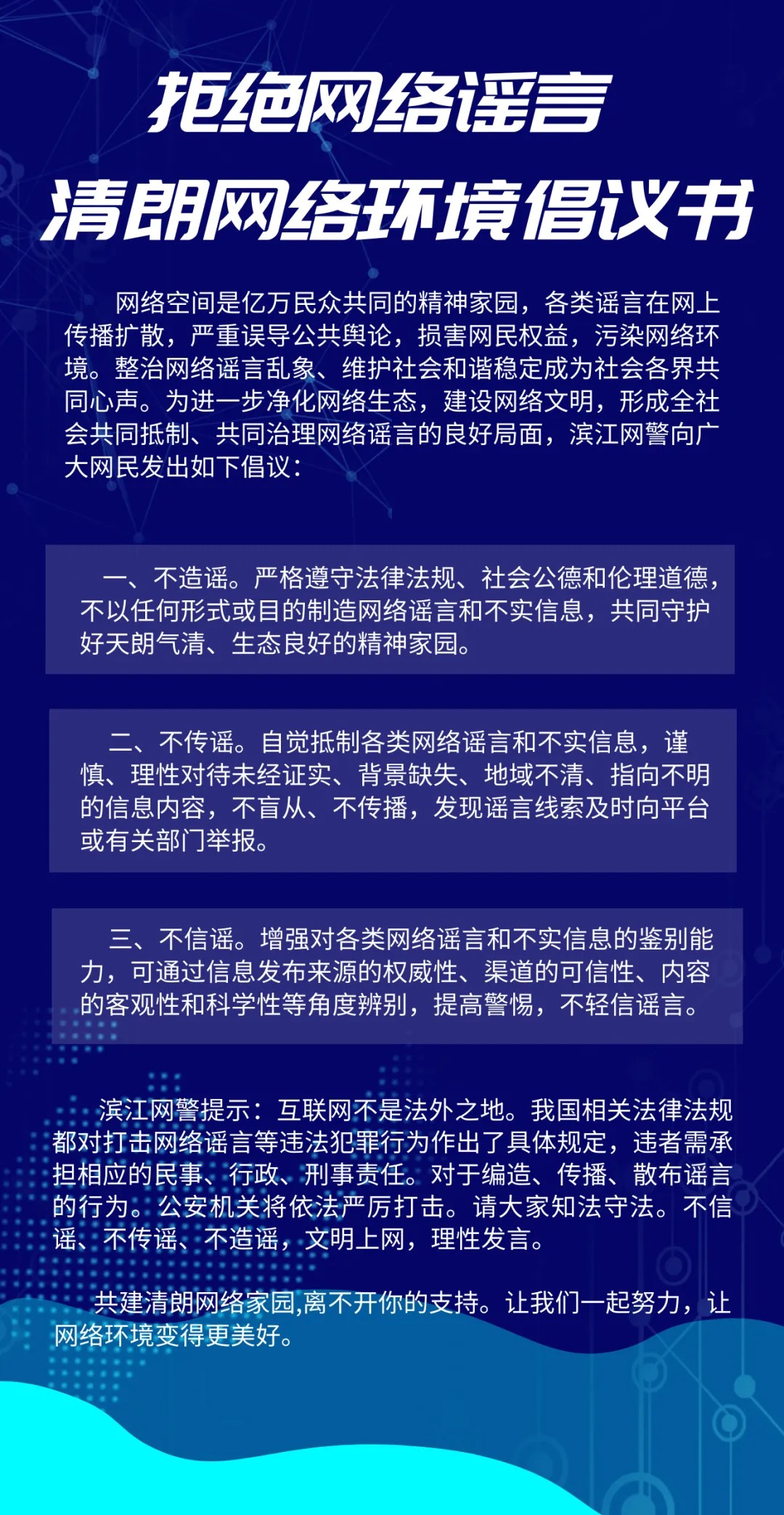 濱江公安拒絕網(wǎng)絡謠言清朗網(wǎng)絡環(huán)境倡議書